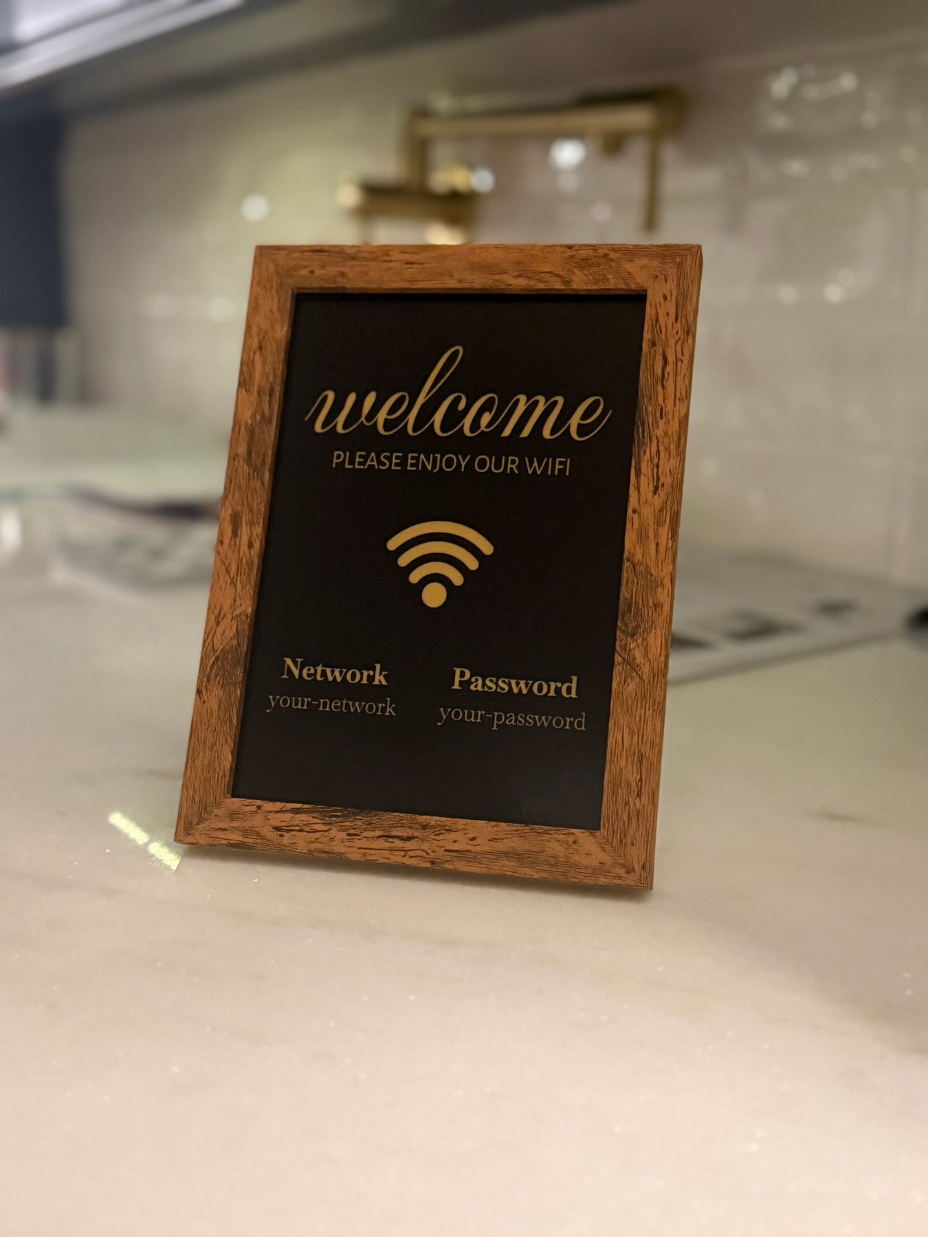 The WiFi Network Sign is a framed acrylic display created to provide clear guest access while maintaining a composed and intentional presentation within the space. It is commonly used in guest rooms, short-term rentals, offices, and reception areas where practical information should be communicated cleanly and without visual clutter.