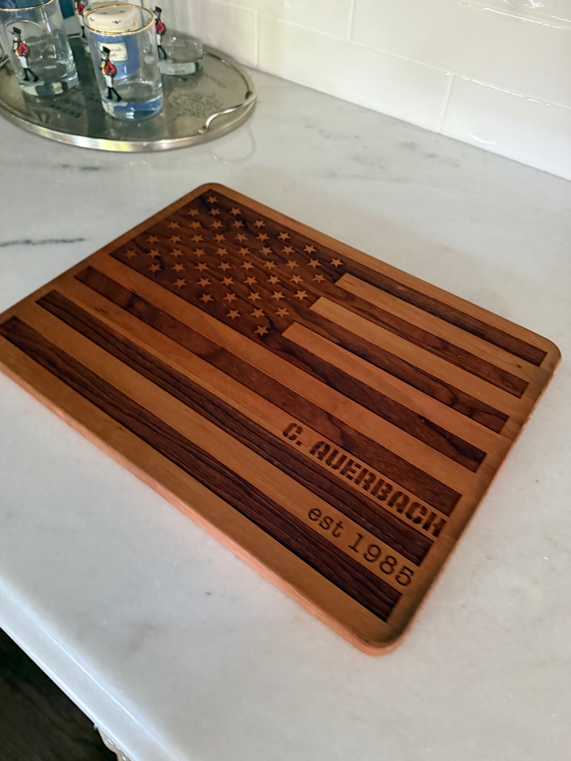 Each board features a full engraved American flag design that spans the entire surface, available in your choice of a classic flat rectangle or a functional board with a drip groove. You also get two custom lines of text, perfect for a family name, a couple’s names, or the latitude and longitude of your home or town. Whether it’s The Johnson Family or Westport, CT – 41.1415° N, 73.3579° W, every detail is engraved with precision.